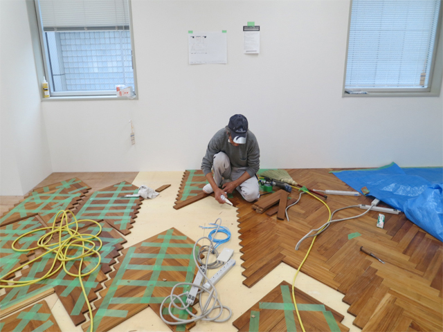 まず第一段は、弊社の新オフィスの床工事風景です。 床材は、ボード株式会社/TH60(チークヘリンボーン/ウレタンクリア) 私たち設計メンバーの場所。。。無理をいってお願いしました。 やっぱりカッコいい。仕事できるのが楽しみ。 このヘリンボーン張りは職人技が光ります♪ 地道な作業にちょっと疲れ気味なようですね。