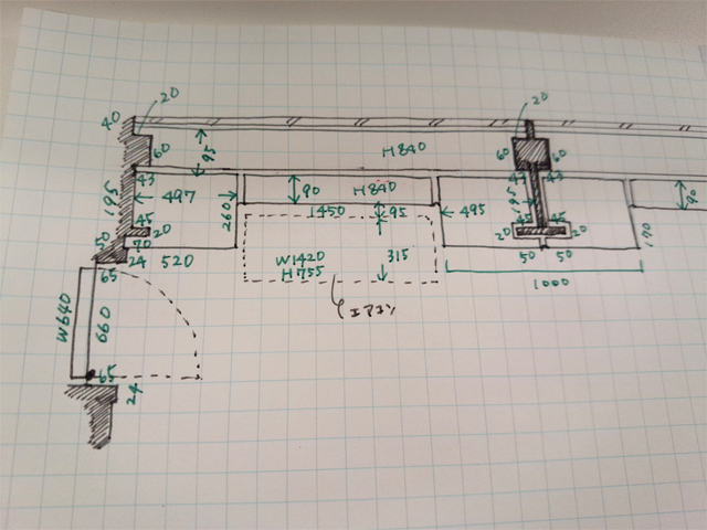 オフィスの窓際にハイカウンター設置の依頼がきました。 現場の寸法をきっちり測ってきました。 これを元にお客様の要望、機能性、納まり、仕上げ等検討しながら図面 手前にある扉にあたらないように。。。。。 エアコンの点検はどうしよう。。。。 検討事項たくさんありそうです。