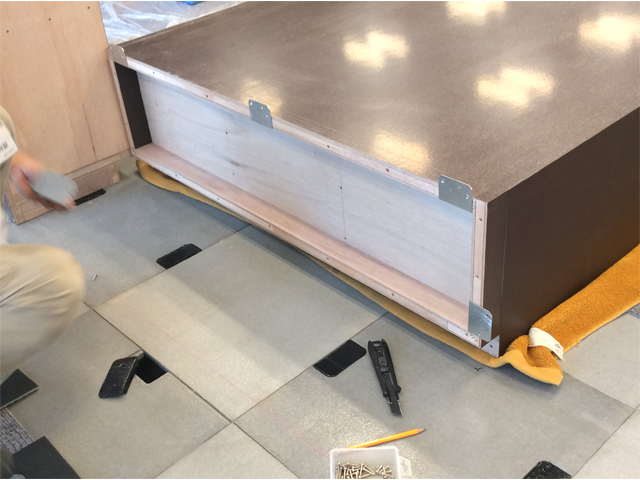 ローキャビネットでも転倒防止用にOAフロアーにL金物を取り付けます。