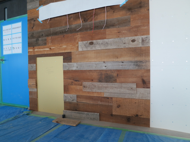 壁面の仕上げとして3種類の不燃古材をランダム貼りしました。