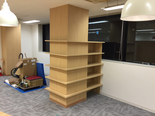 既存柱を利用して柱まわりにはマガジンラック、柱と窓際の壁との間には