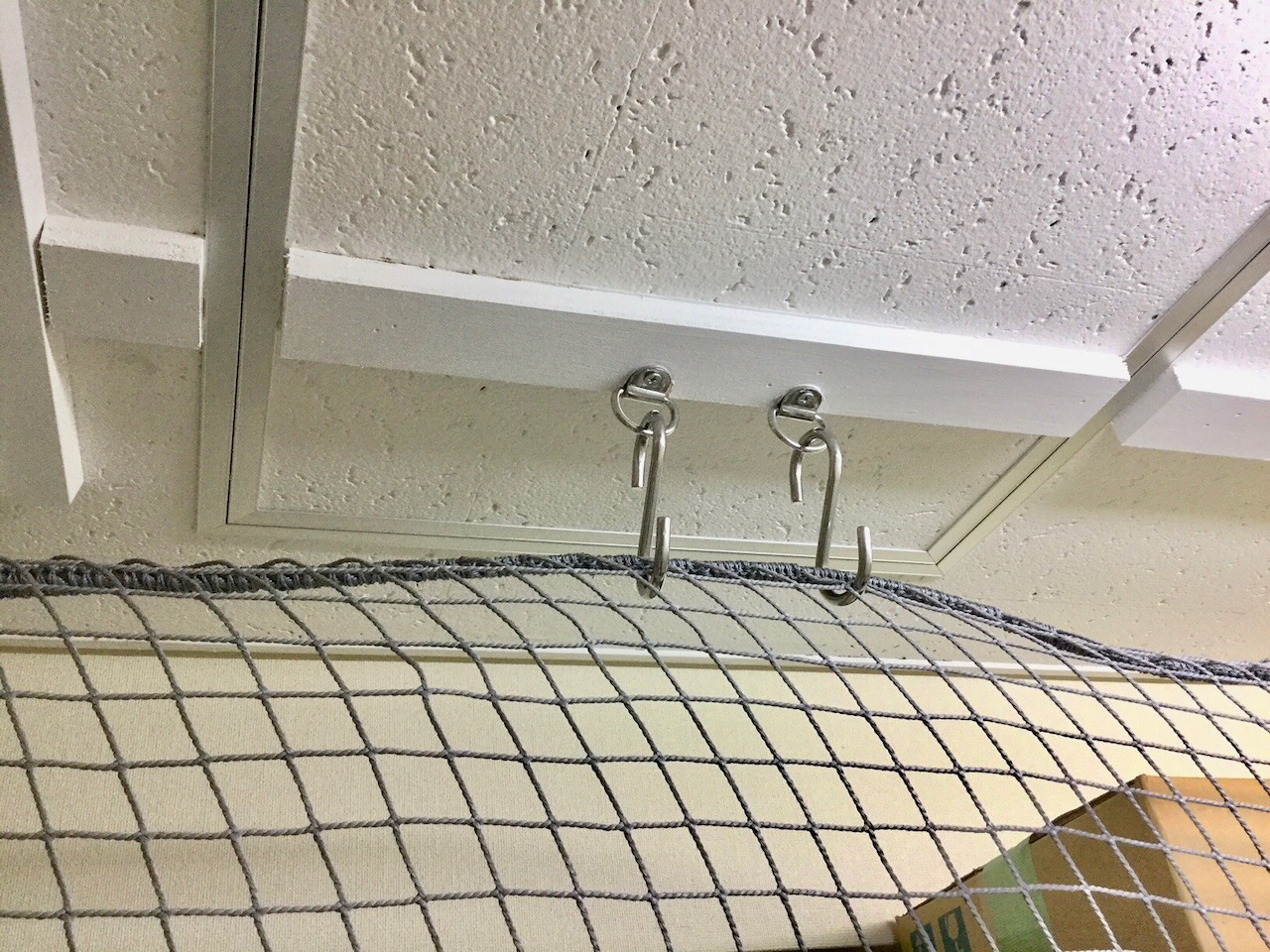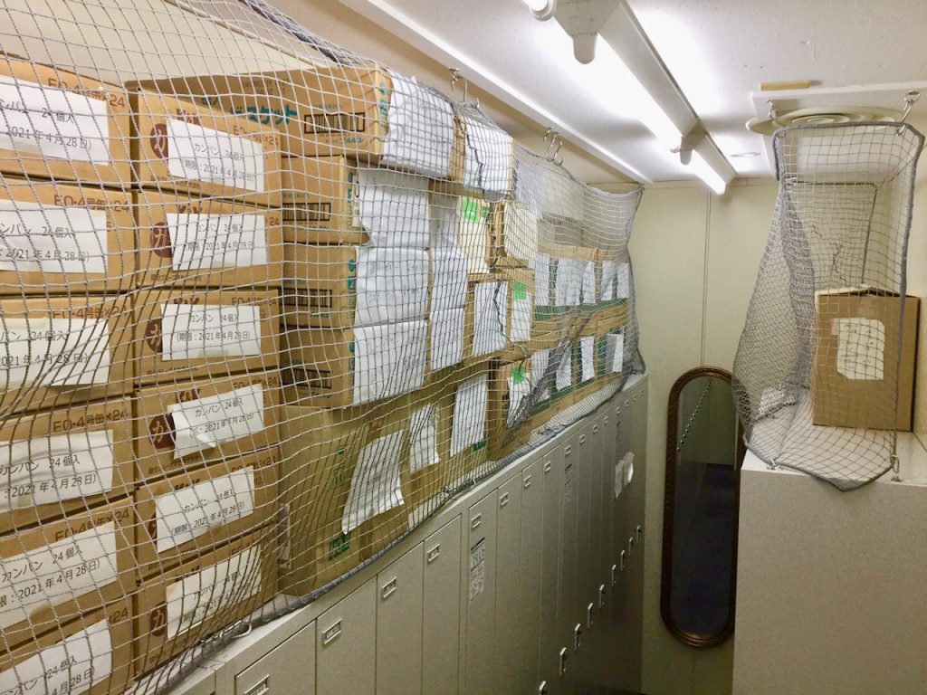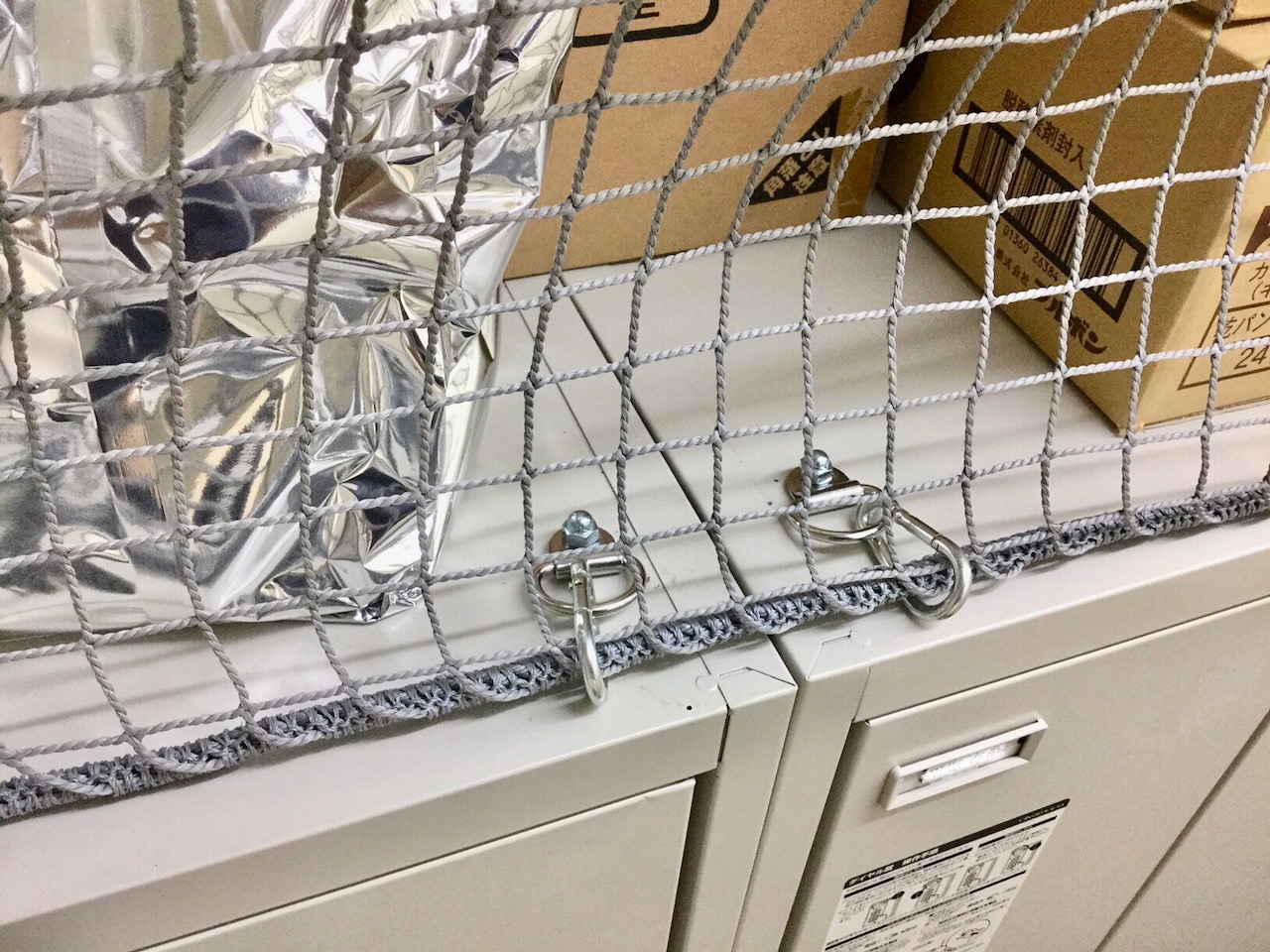 ロッカールームに備蓄品用の落下防止ネットを取付しました。