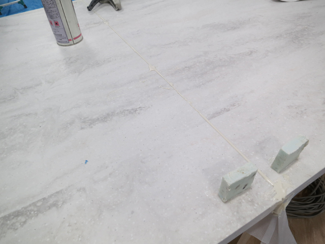↑の写真は、シームレス加工(人工大理石同士の接着)を行っているところです