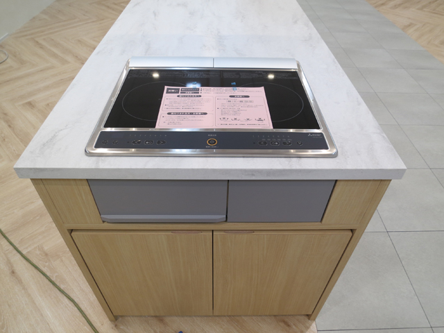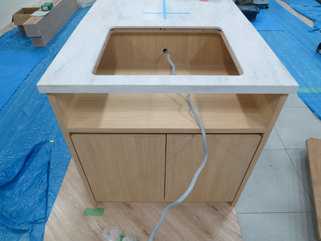人工大理石の据付が完了しましたのでIHコンロのセッティングに取り掛かります。