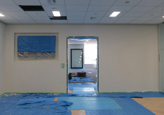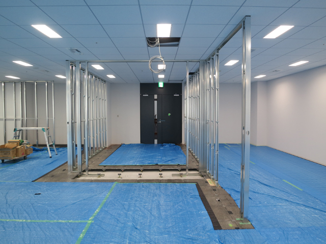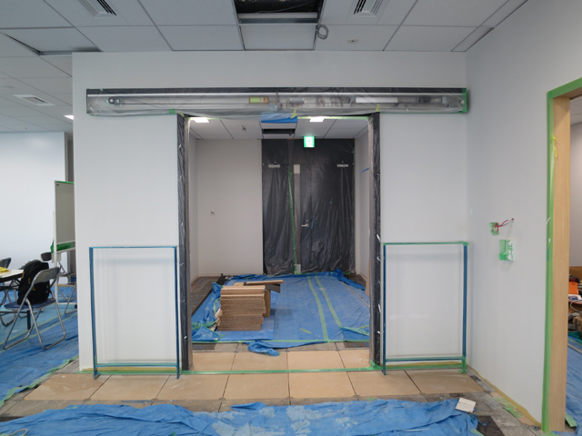 自動ドア設置の為の内部補強など、現場ではミリ単位で微調整が行われています。
