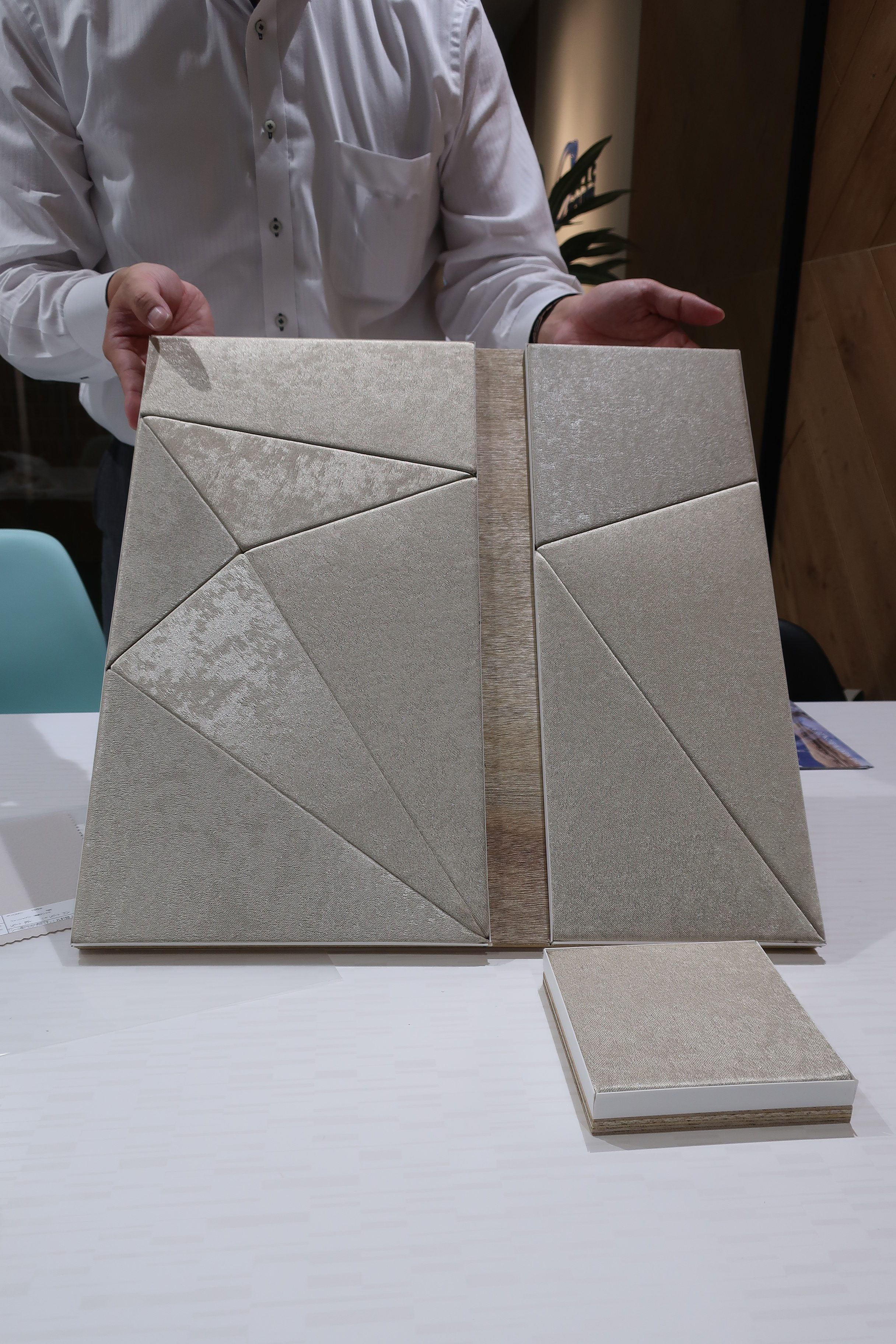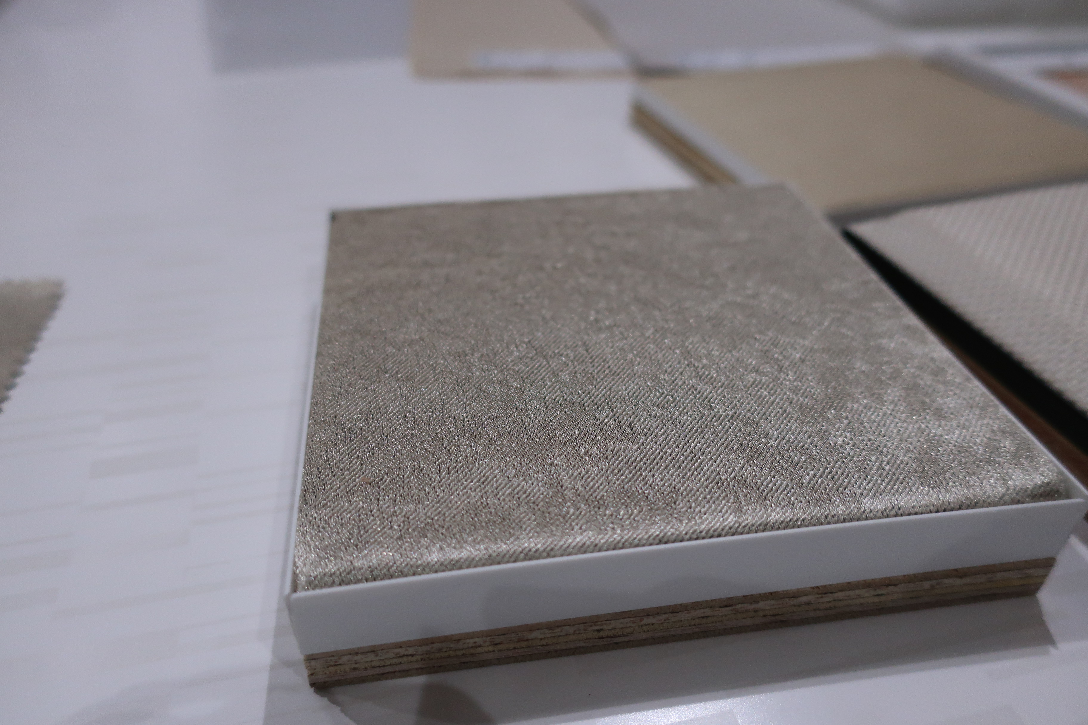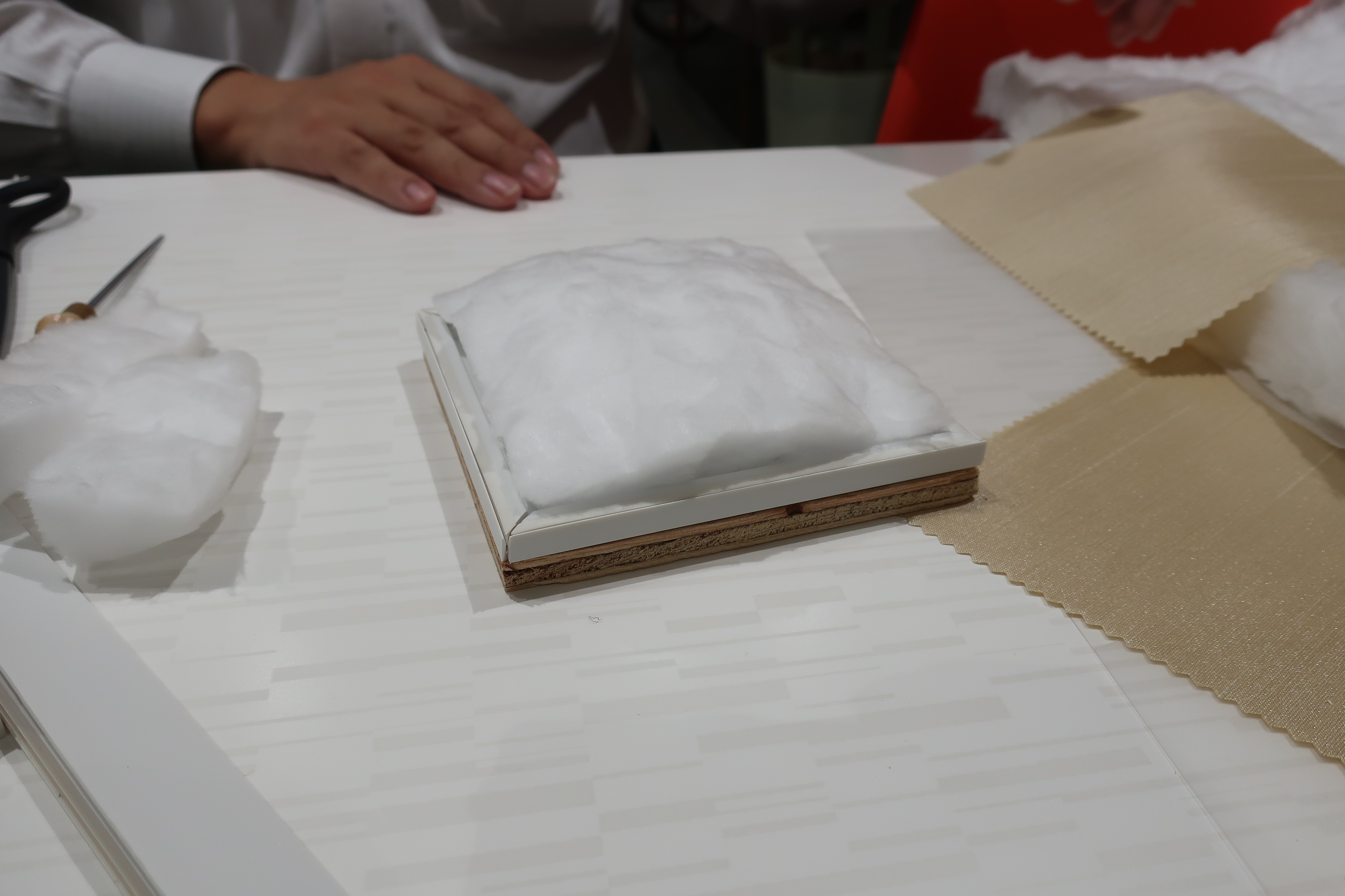 弊社にて、川島織物セルコン様によるファブエースの布張り実演会を行いました。