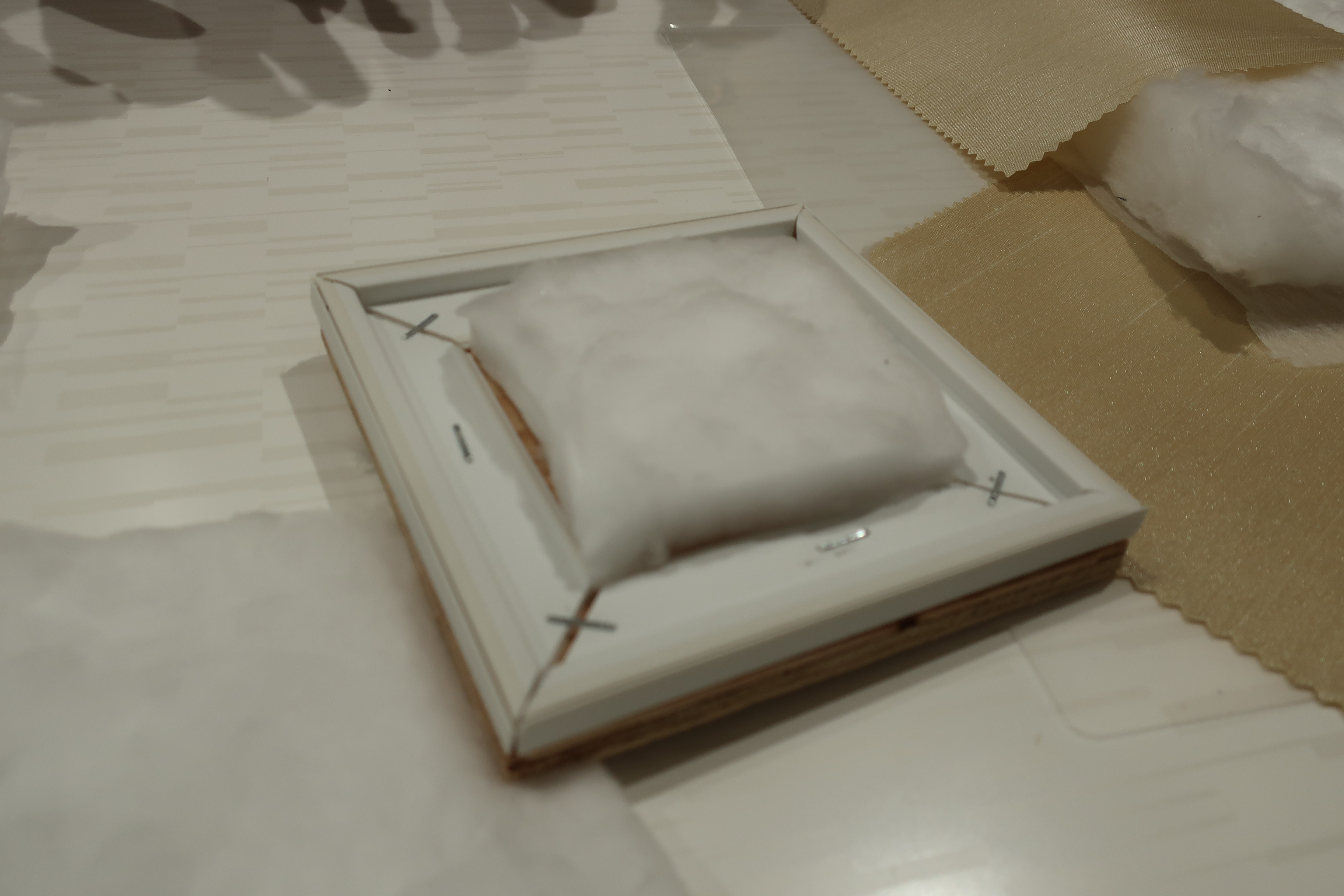 小さいモルトンの上に、大きいモルトンを重ねてから布張りをします。