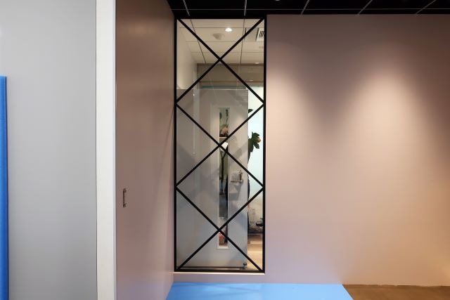 ひし形に組まれたガラスフレームを施工しました。