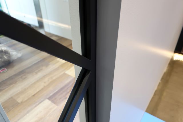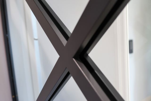 2種類の角パイプを組み合わせて制作しており、外枠とのチリ寸法やクロス部の角度を