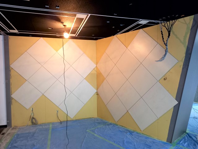 正方形のタイルを45度回転させてひし形になるように壁面にレイアウトしていきます。