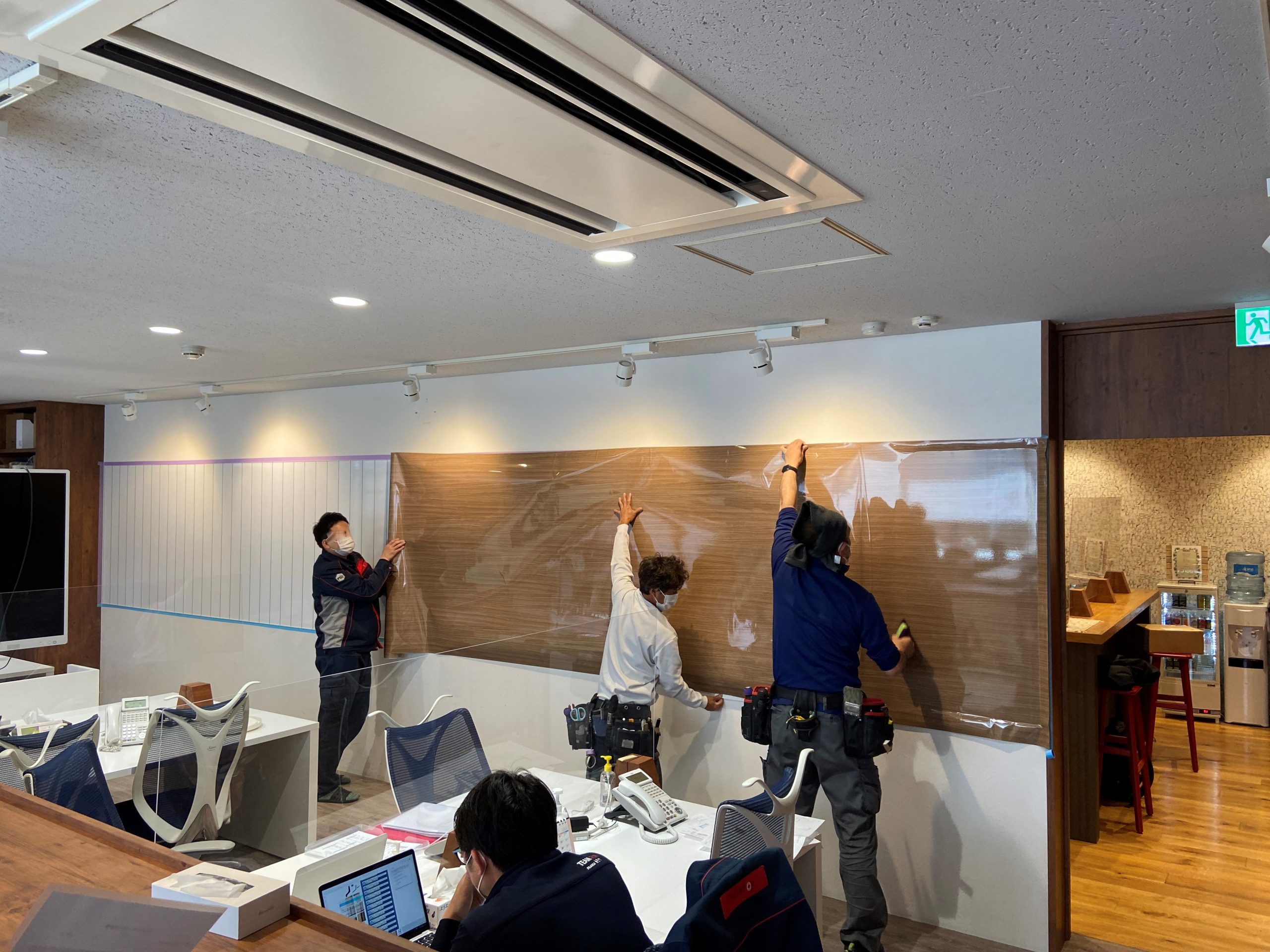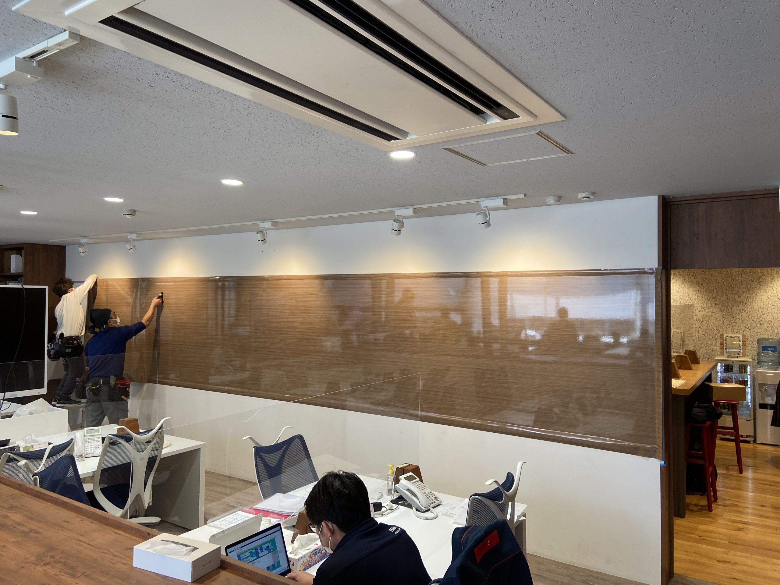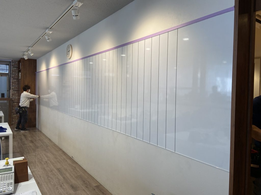 既存のホワイトボードに木目調のホワイトボードシートをそのまま上から増し貼りします