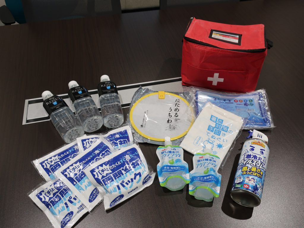 水や経口補水液、瞬間冷却パックなど事前に予防できるアイテムが入っております。