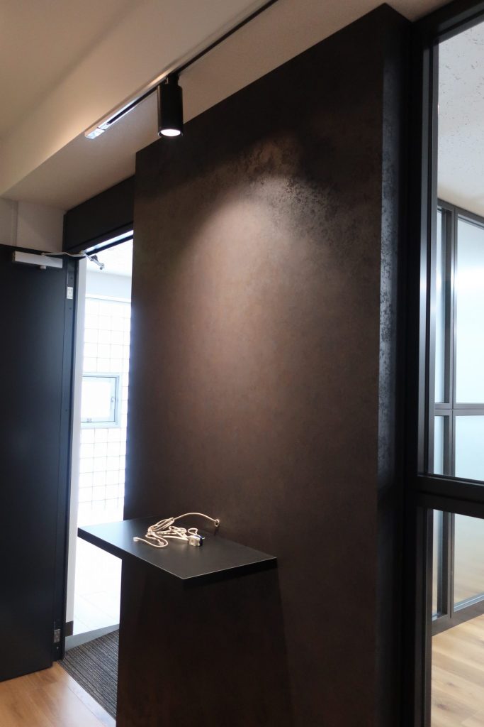 こちらエントランスの造作壁に黒皮風塗装の塩ビシートを貼り
