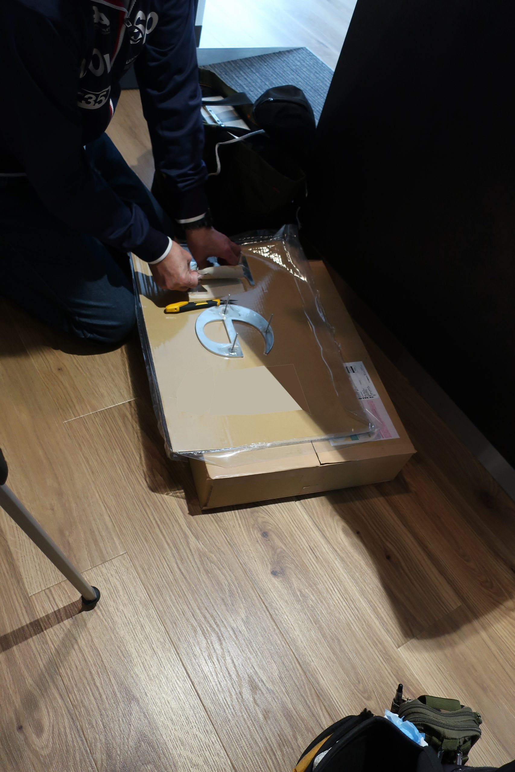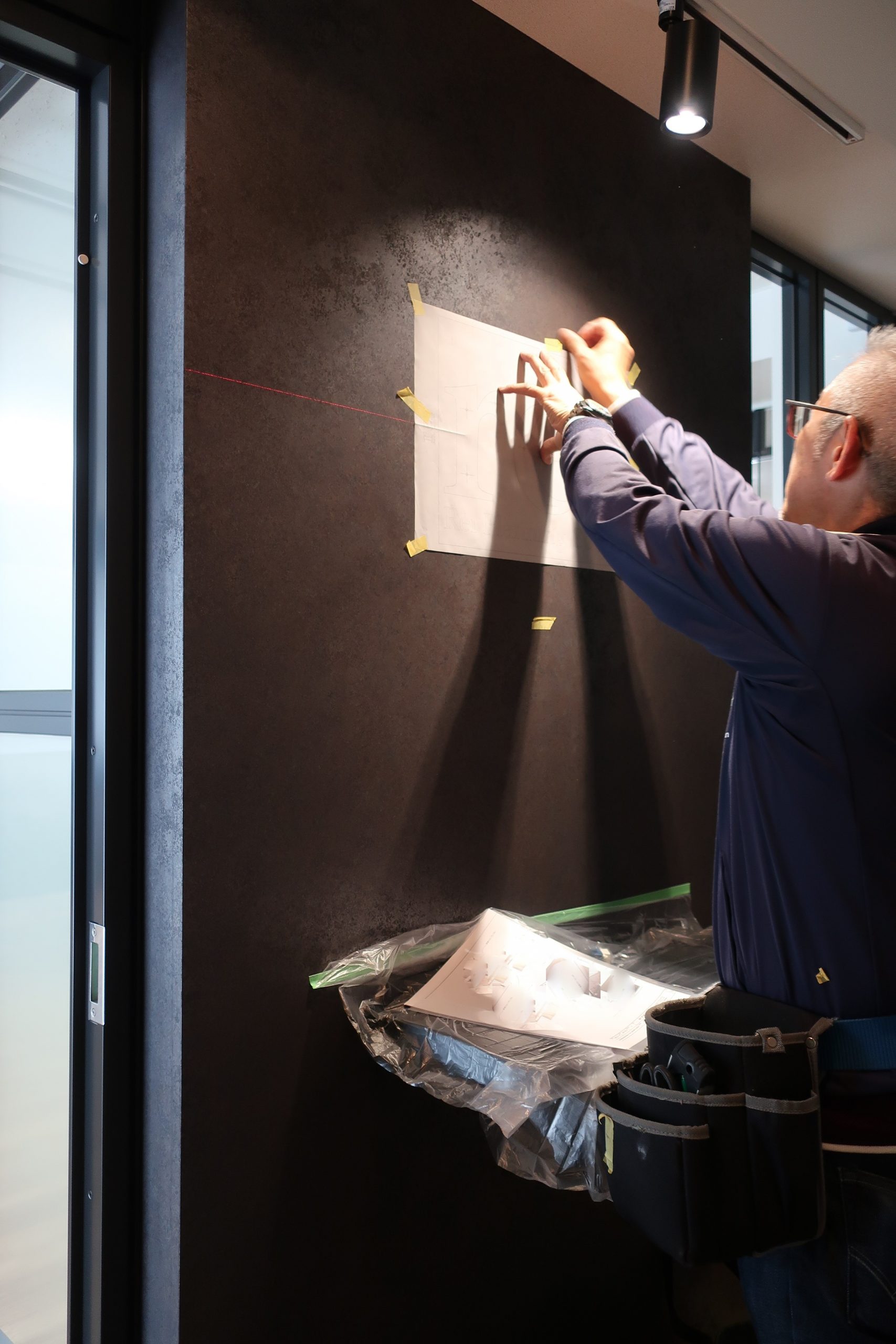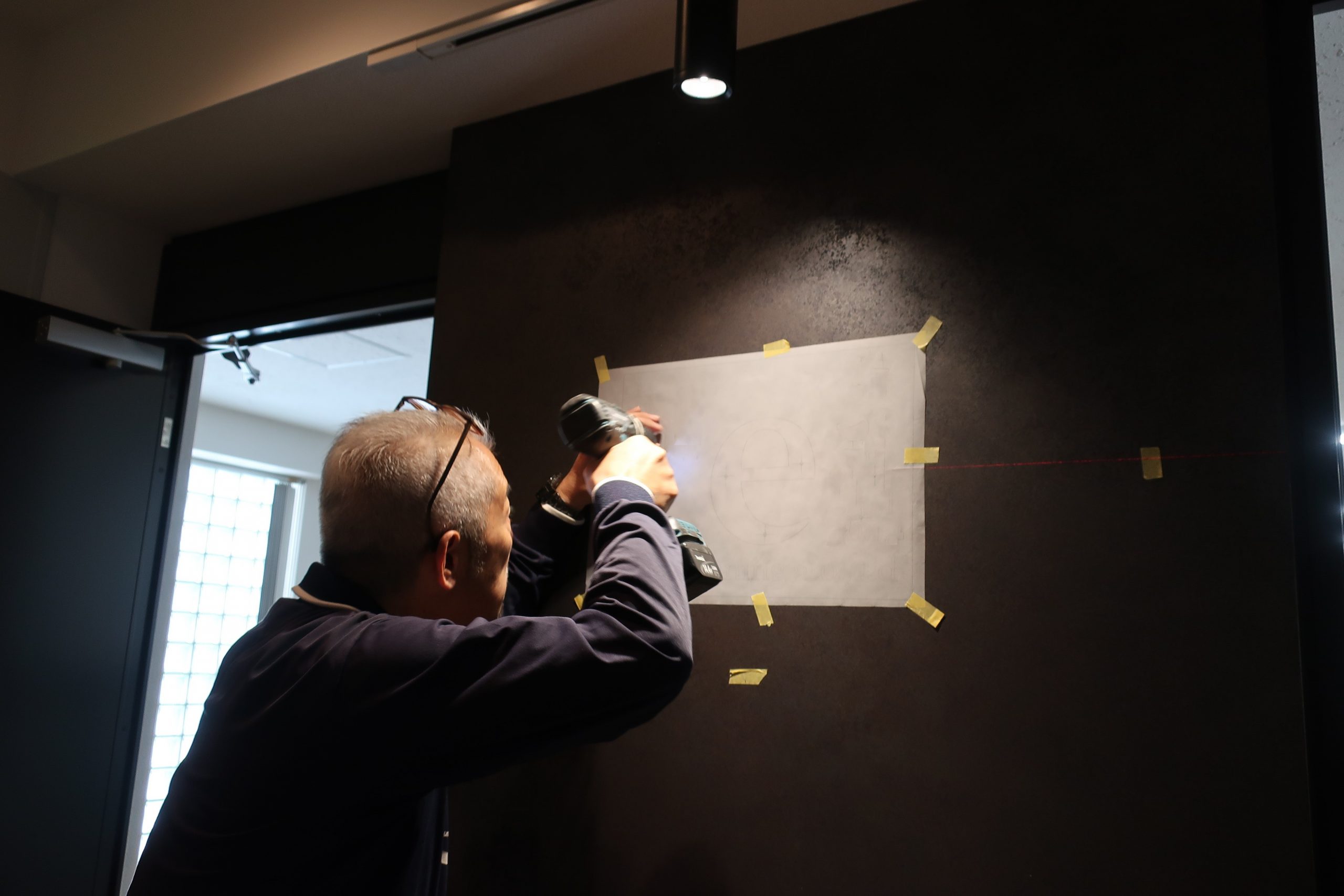 用紙に印字されているピンの位置に電動工具で壁に穴をあけます