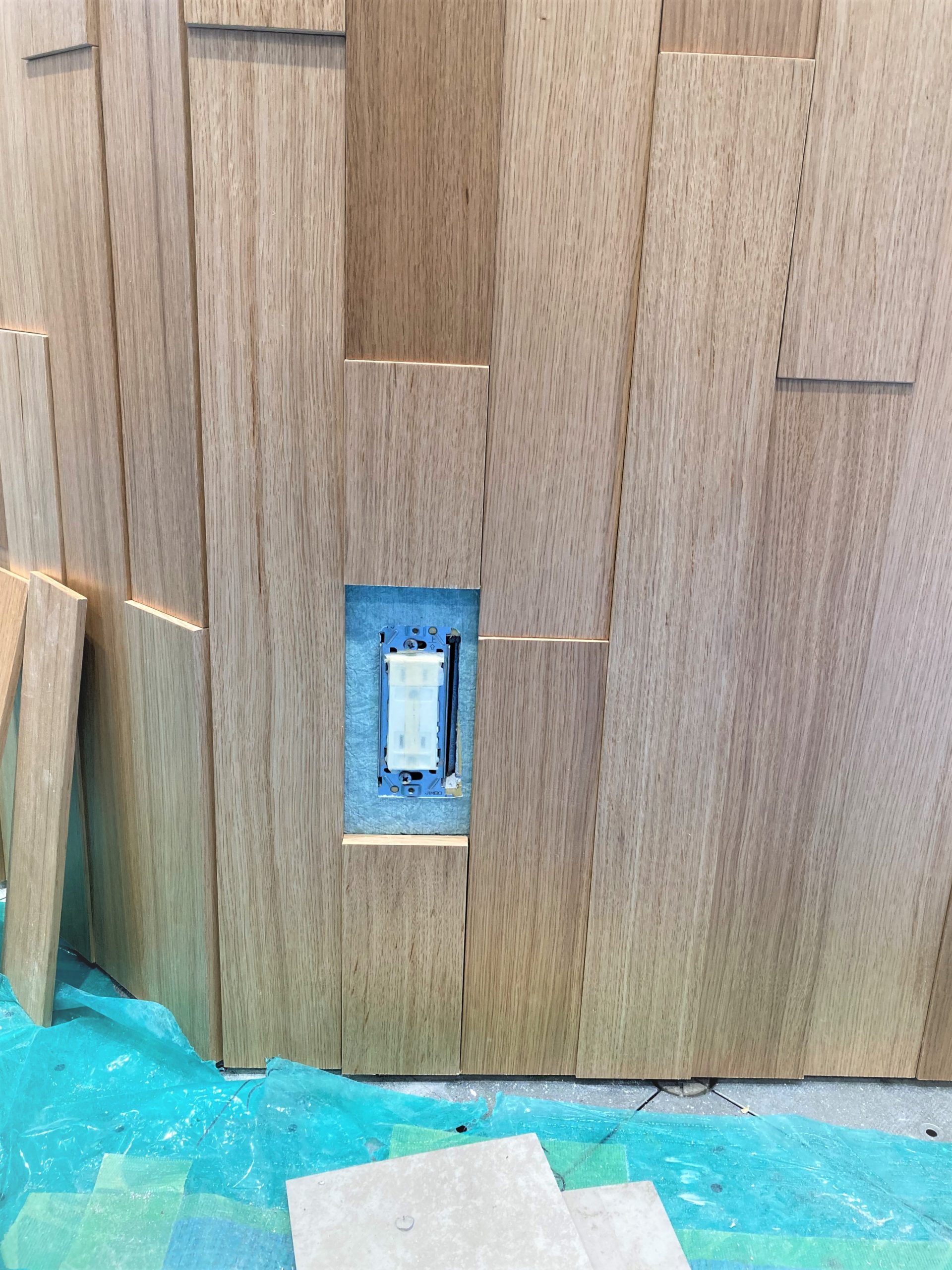 家具コンセントやスイッチ部分は、⽊板を切り⽋いて綺麗に納めていきます。