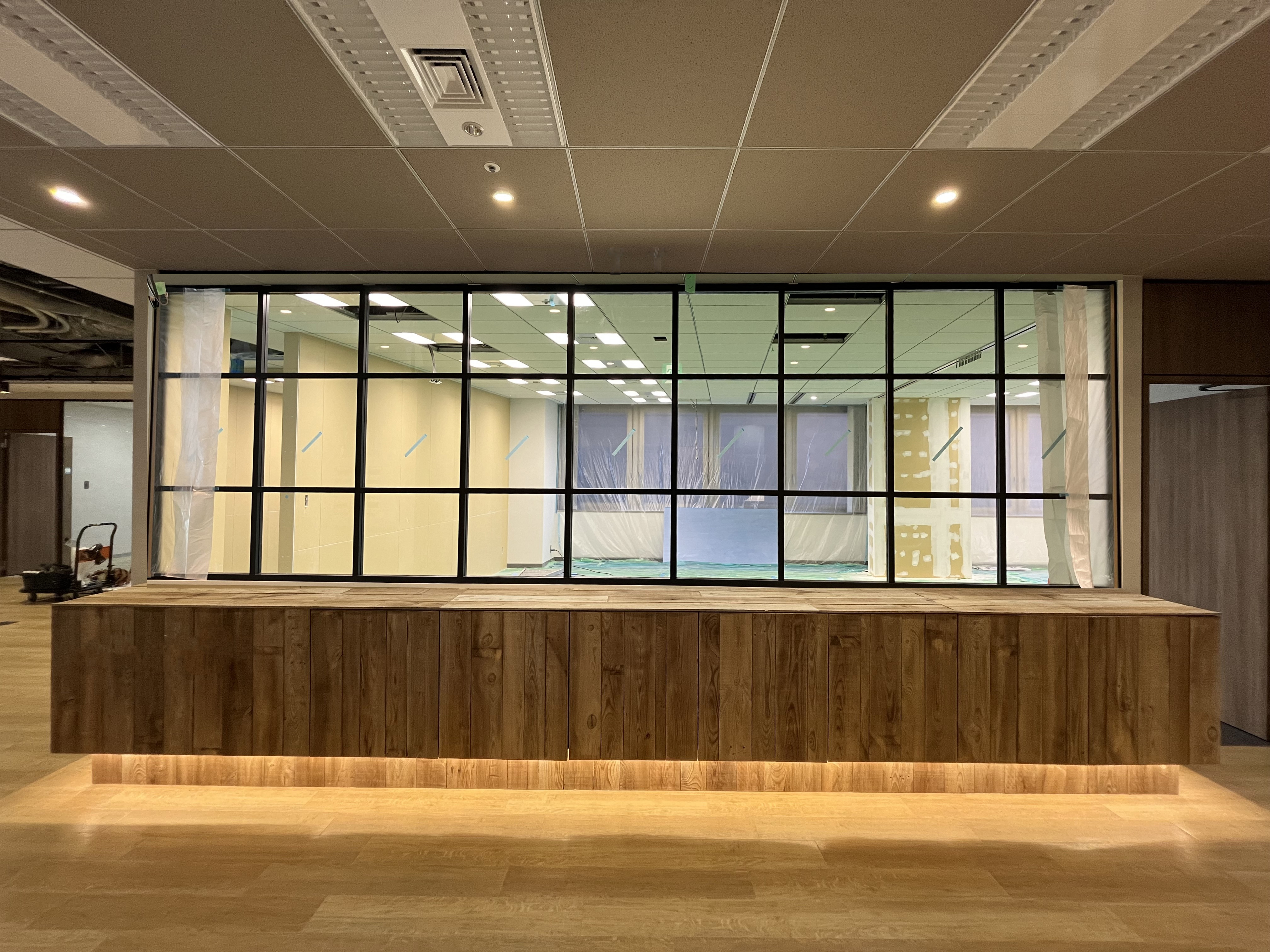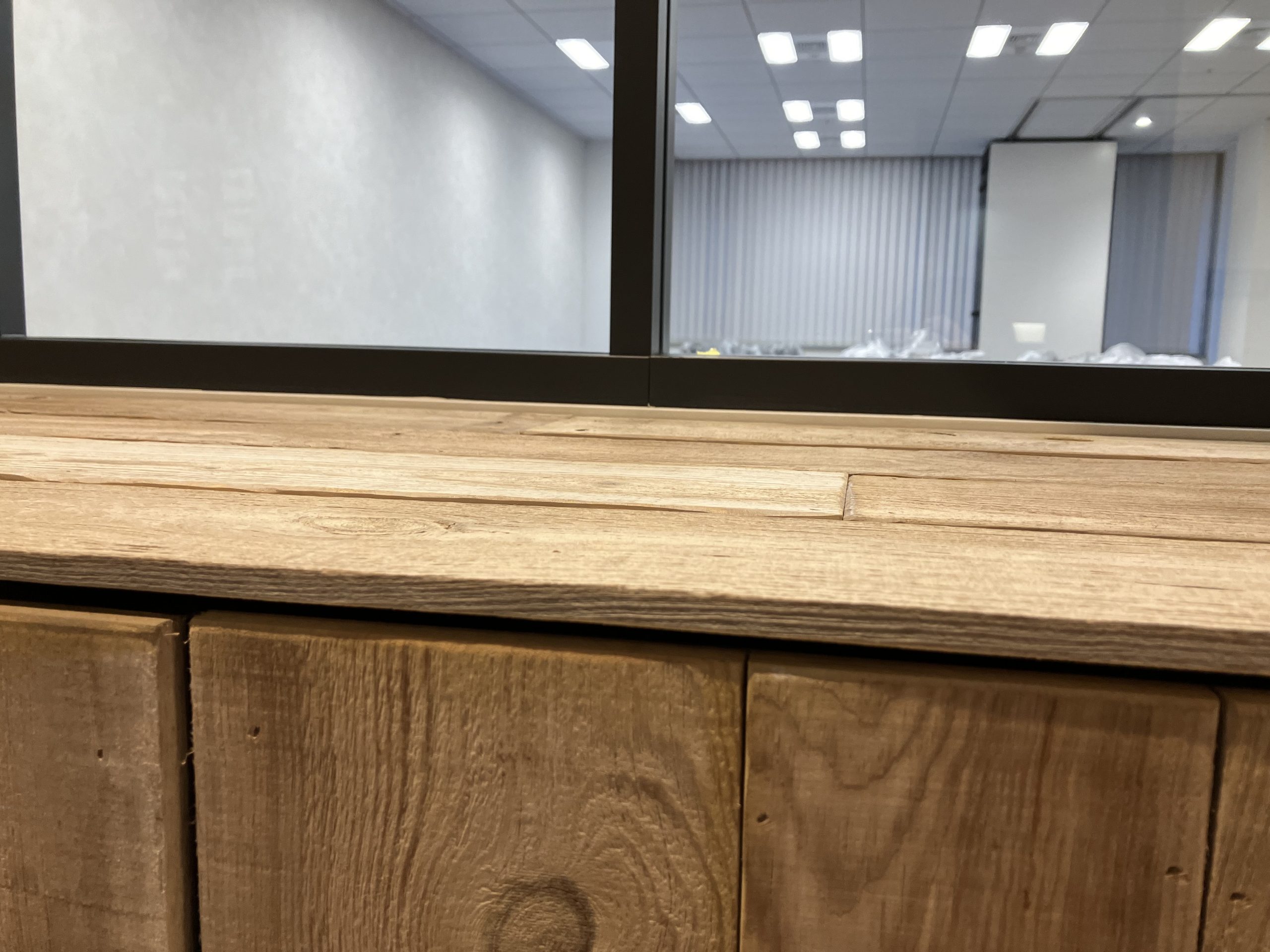 使⽤した古材はアルベロプロさんの”グレイウッド ビーチスタイル No2”