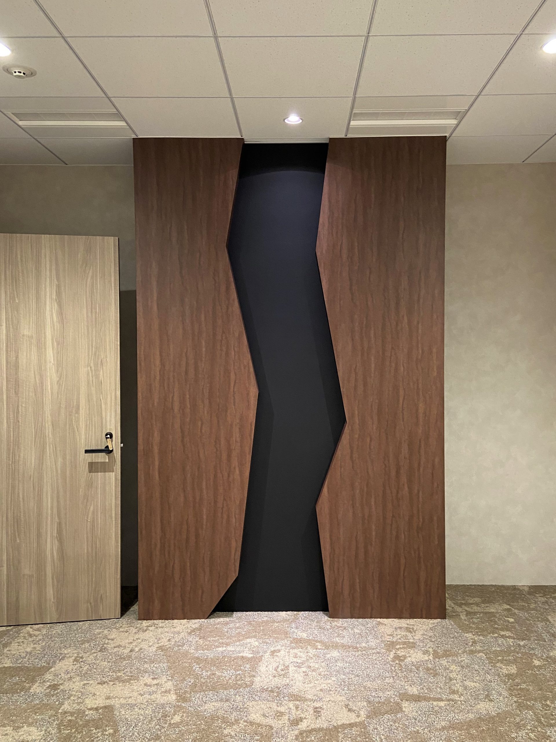 床から天井にかけて、ジグザグと掘り込みのある造作壁を施⼯しました。