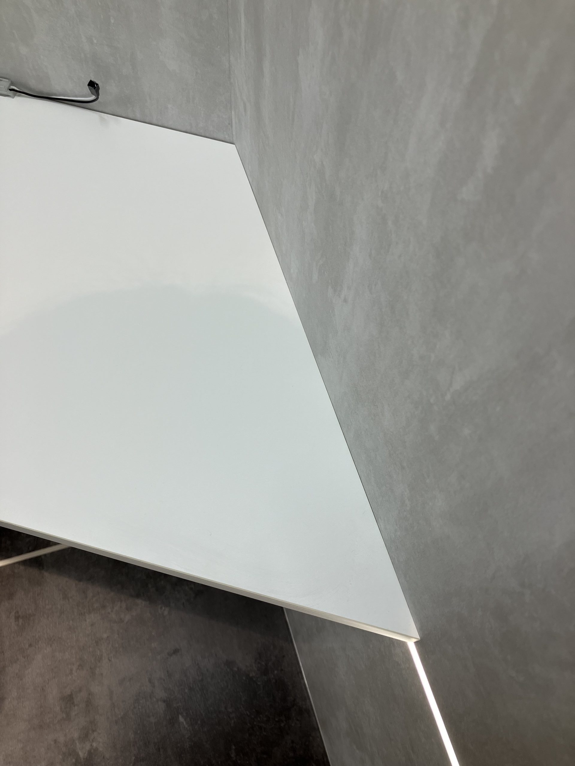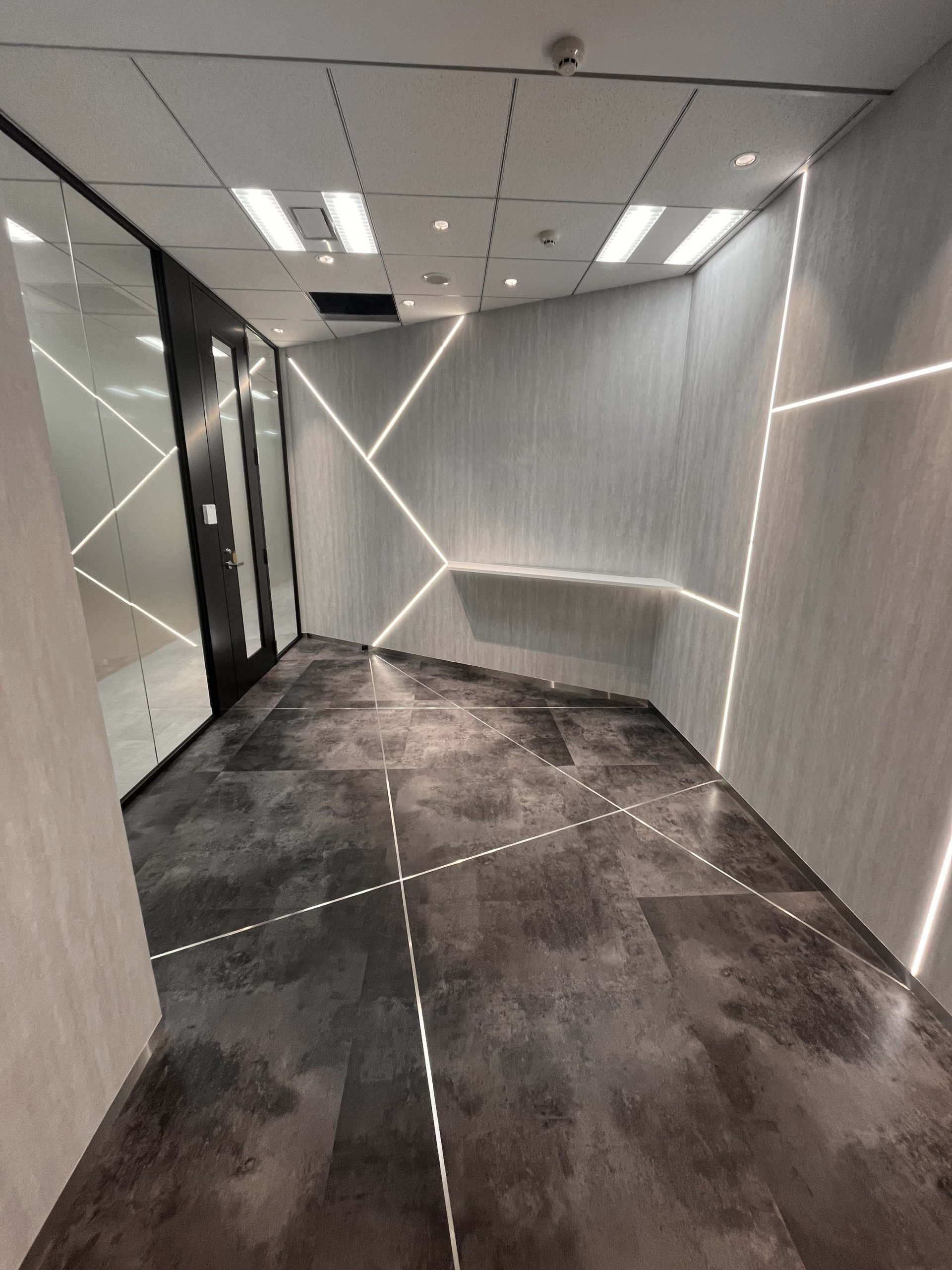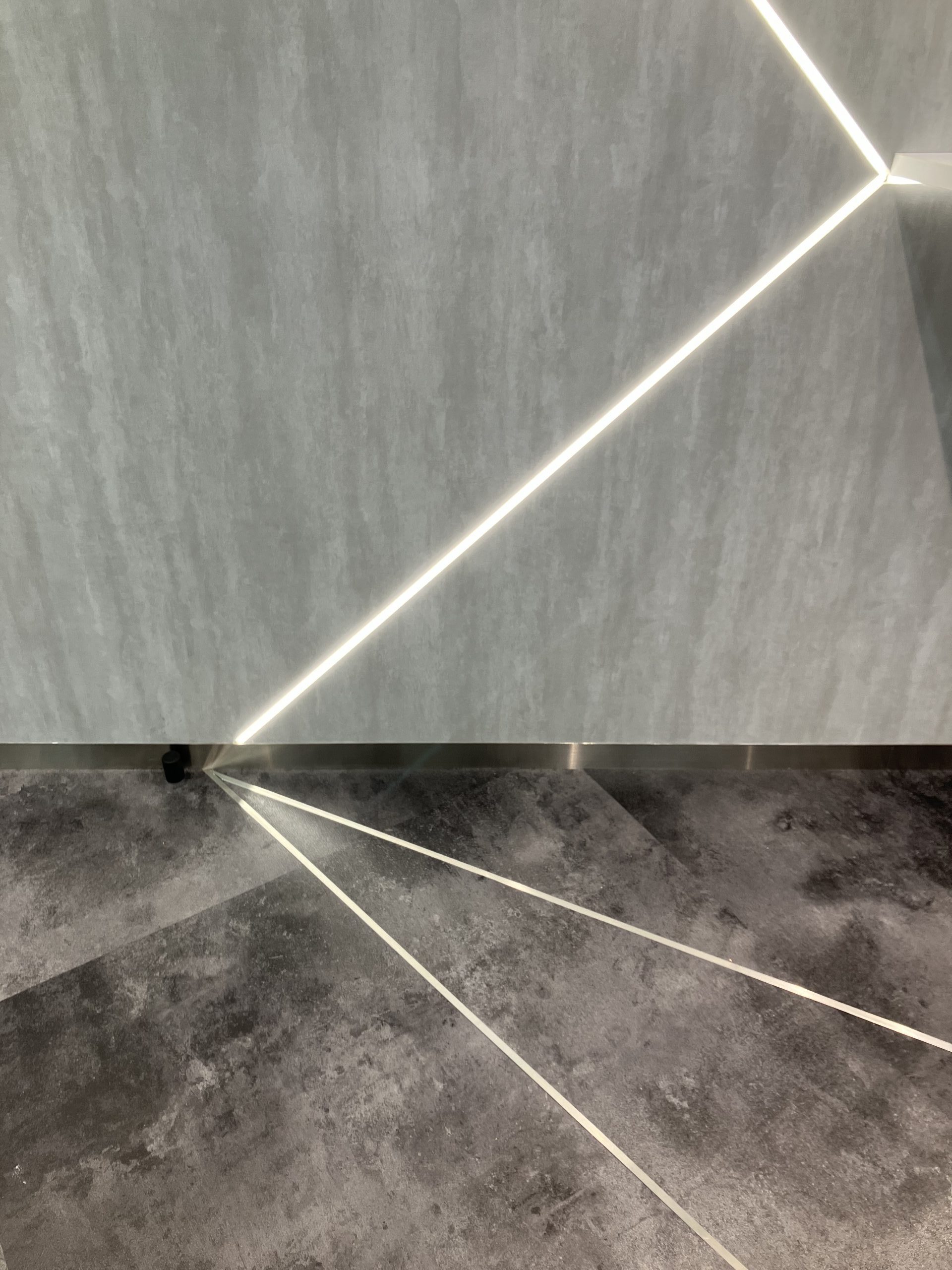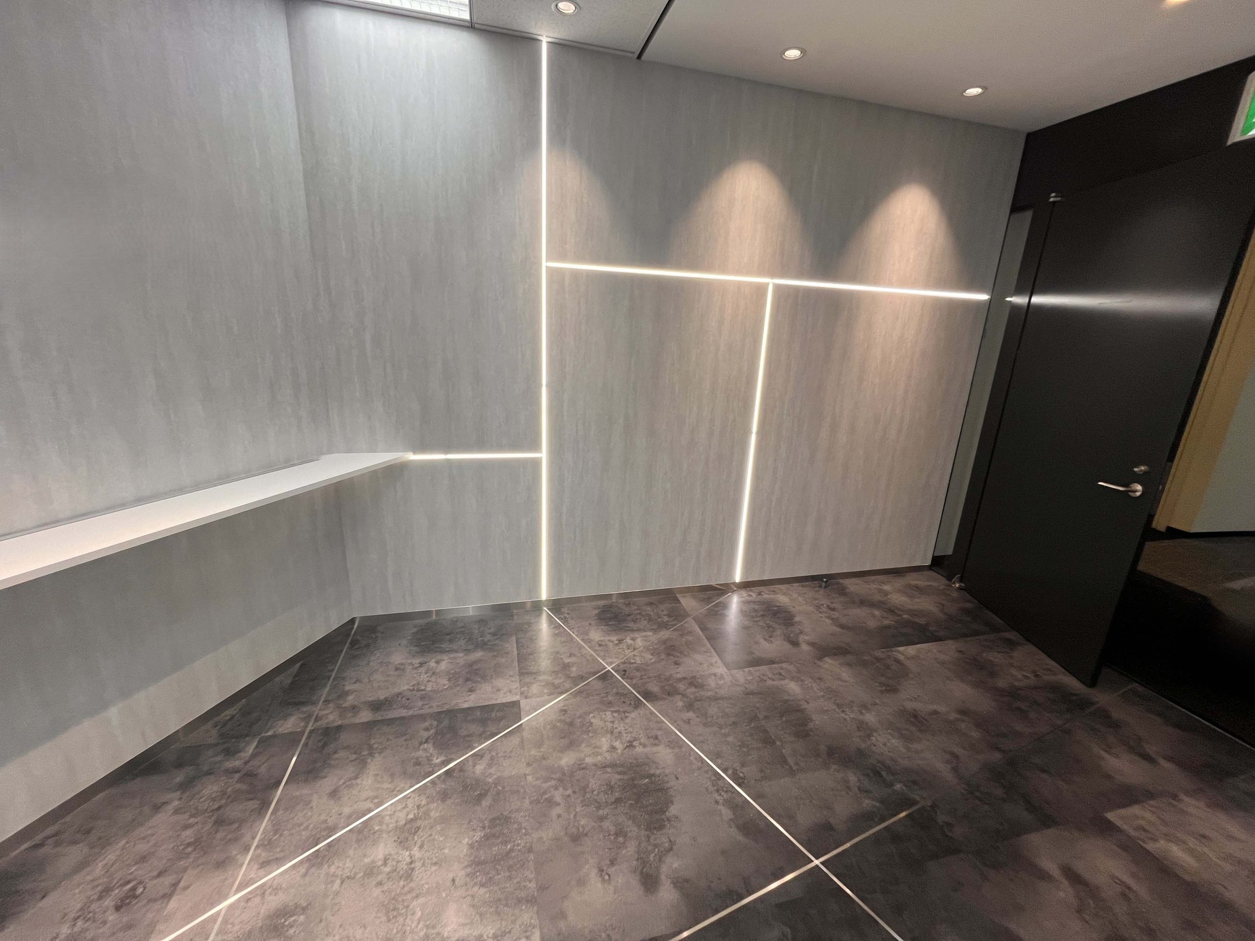 受付台もラインの一部になるよう、ライン照明に高さを合わせて設置。